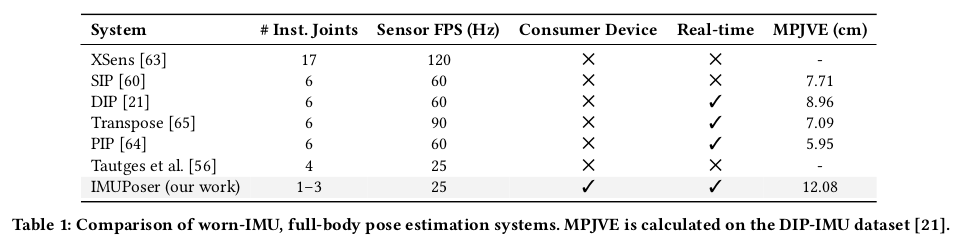 기존 IMU 기반이 논문들은 특수한 장비를 사용, 실생활 적용에는 현실적이지 않음, 해당 논문에서는 실제 consumer device를 활용하여 pose estimation을 진행하는 장점이 있음