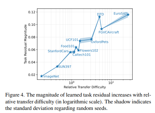 Transfer difficulty가 높을 수록 task residual magnitude가 증가