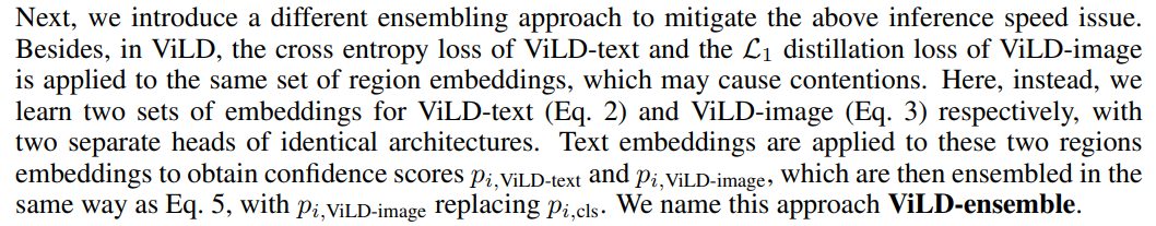 CLIP의 결과를 ViLD-image의 결과로 대체, 대신 ViLD-text와 ViLD-image는 독립적인 embedding 정보로 따로 학습