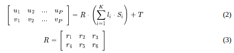 해당 식은 카메라 parameter를 사용해서 3d shape이 이미지에서 어떻게 보이는지를 계산하는 식