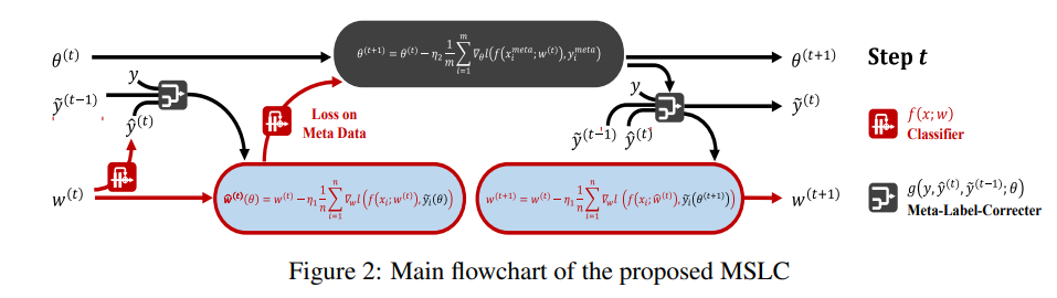 clean data 에서 계산된 loss가 label corrector(theta)에 전파 (이전 MLC과 유사)
