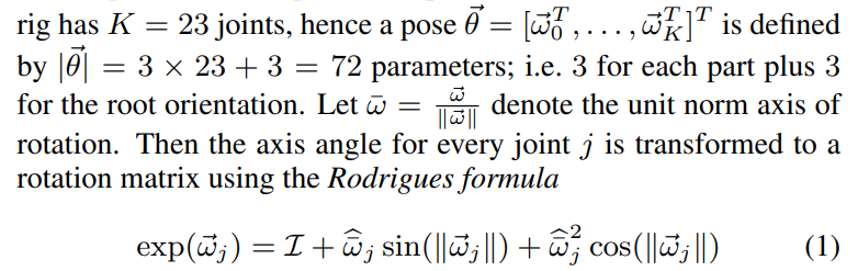 Pose parameter는 joint 하나당 3d orientation을 나타내며 추가적으로 root orientation을 포함한다. (joint가 상대적인 orientation이다보니 reference가 되는 root orientation이 필요해 보임)