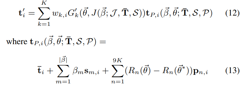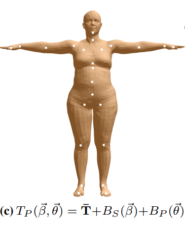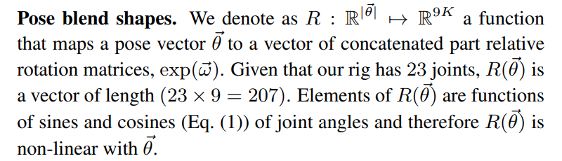 여기서 함수 B_P는 해당 pose parameter를 바탕으로 구한 R(relative rotation matric)의 차이(template pose와 target pose사이의 차이)를 vertex displacement(학습을 통해 구해지는 값)와 연산을 통해 실제 vertices를 구할 수 있다.