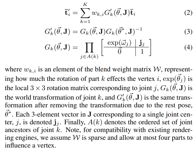 우선 zero pose(여기서는 평균 template pose라고 생각해도 될 듯)에 대한 N개의 vertices를 정의한다. 즉 reference에 해당하는 template이며 여기에 추가적으로 blend weight를 정의한다. Blend weight는 K개의 joint가 해당 vertices에 미치는 영향을 나타낸다. (추후 학습을 통해 구해지는 것 같음)